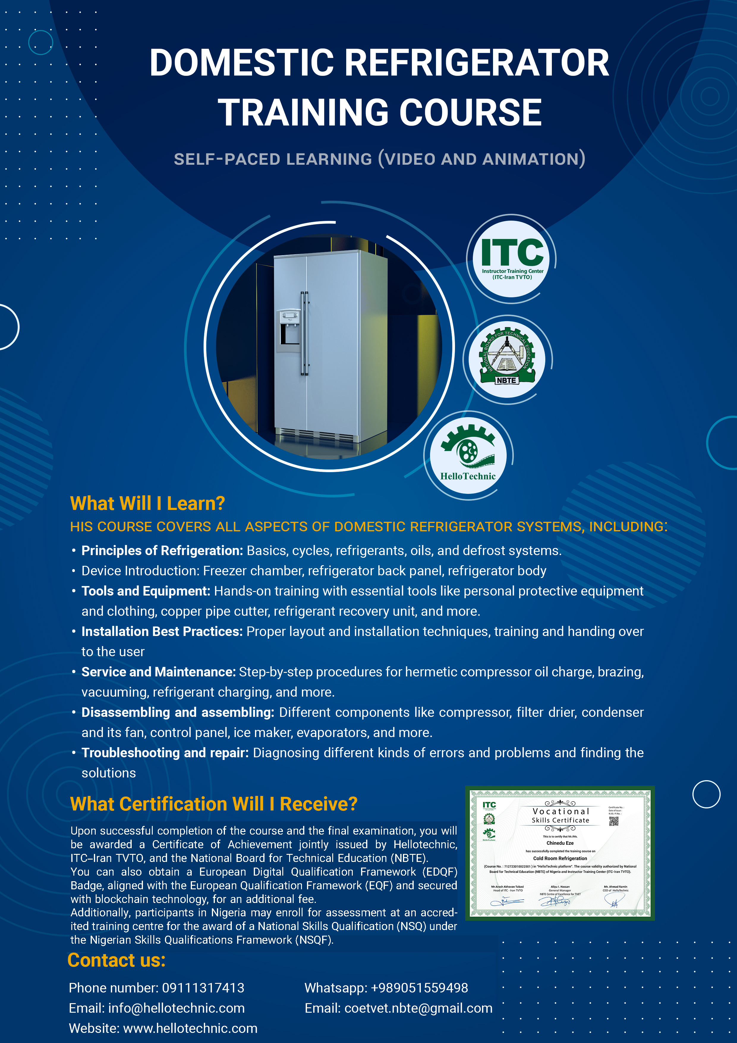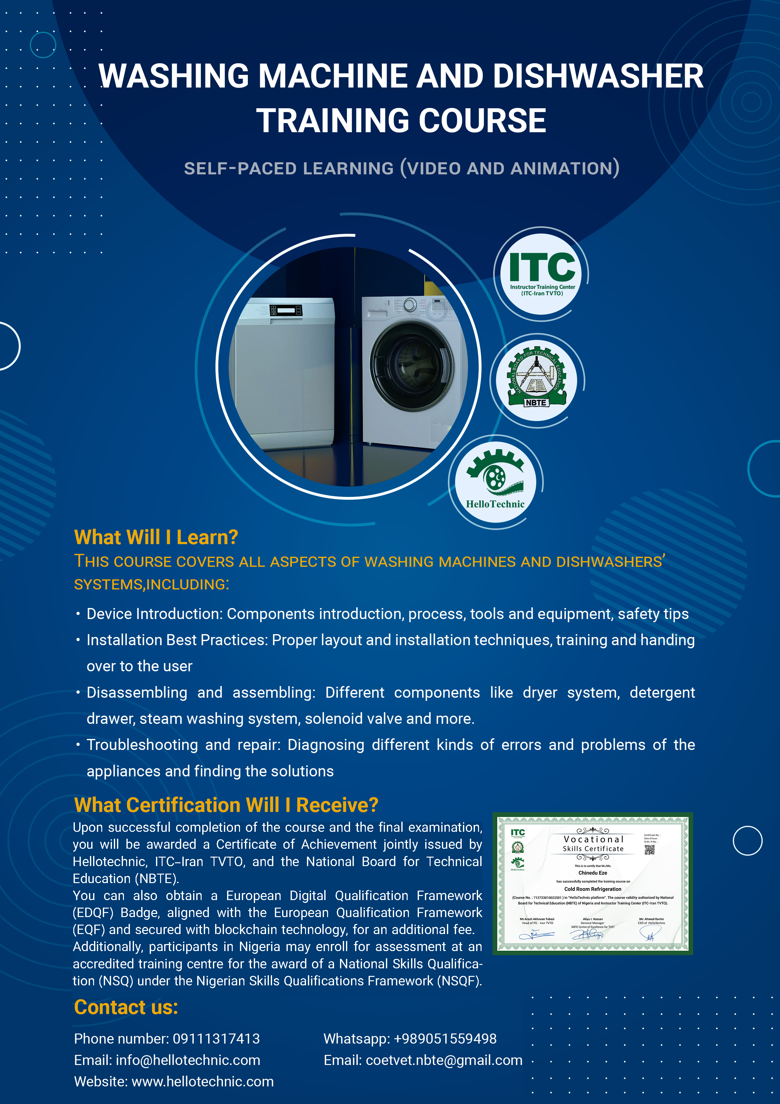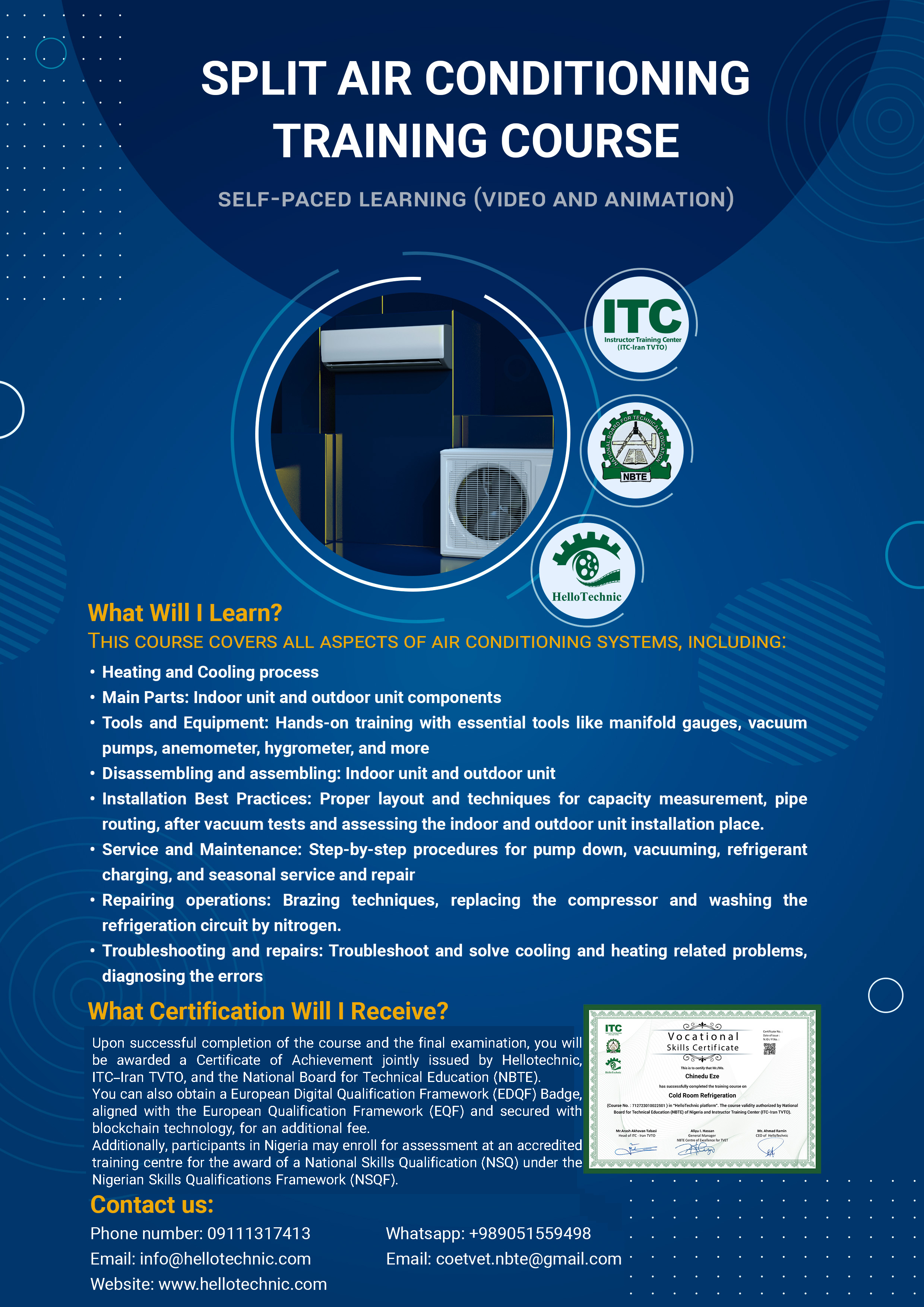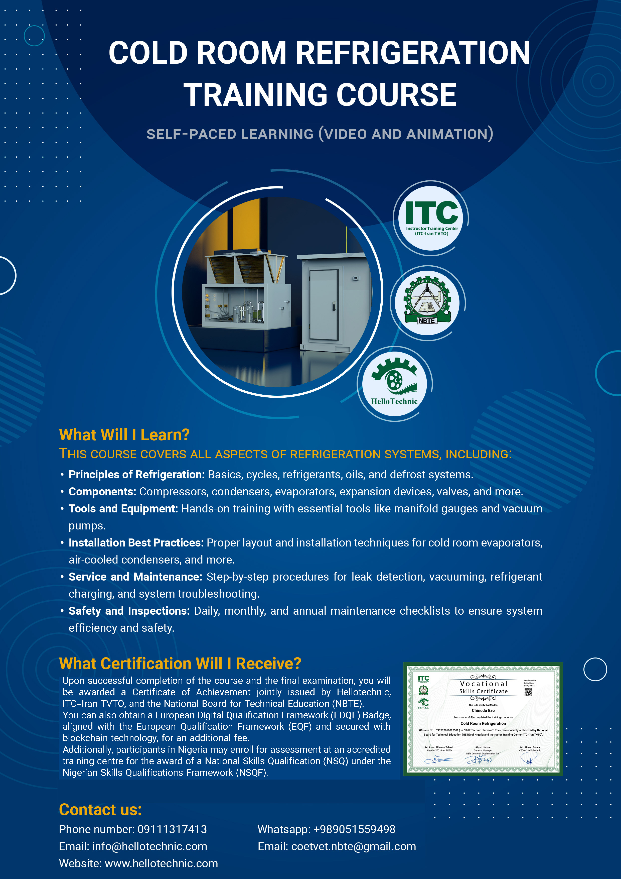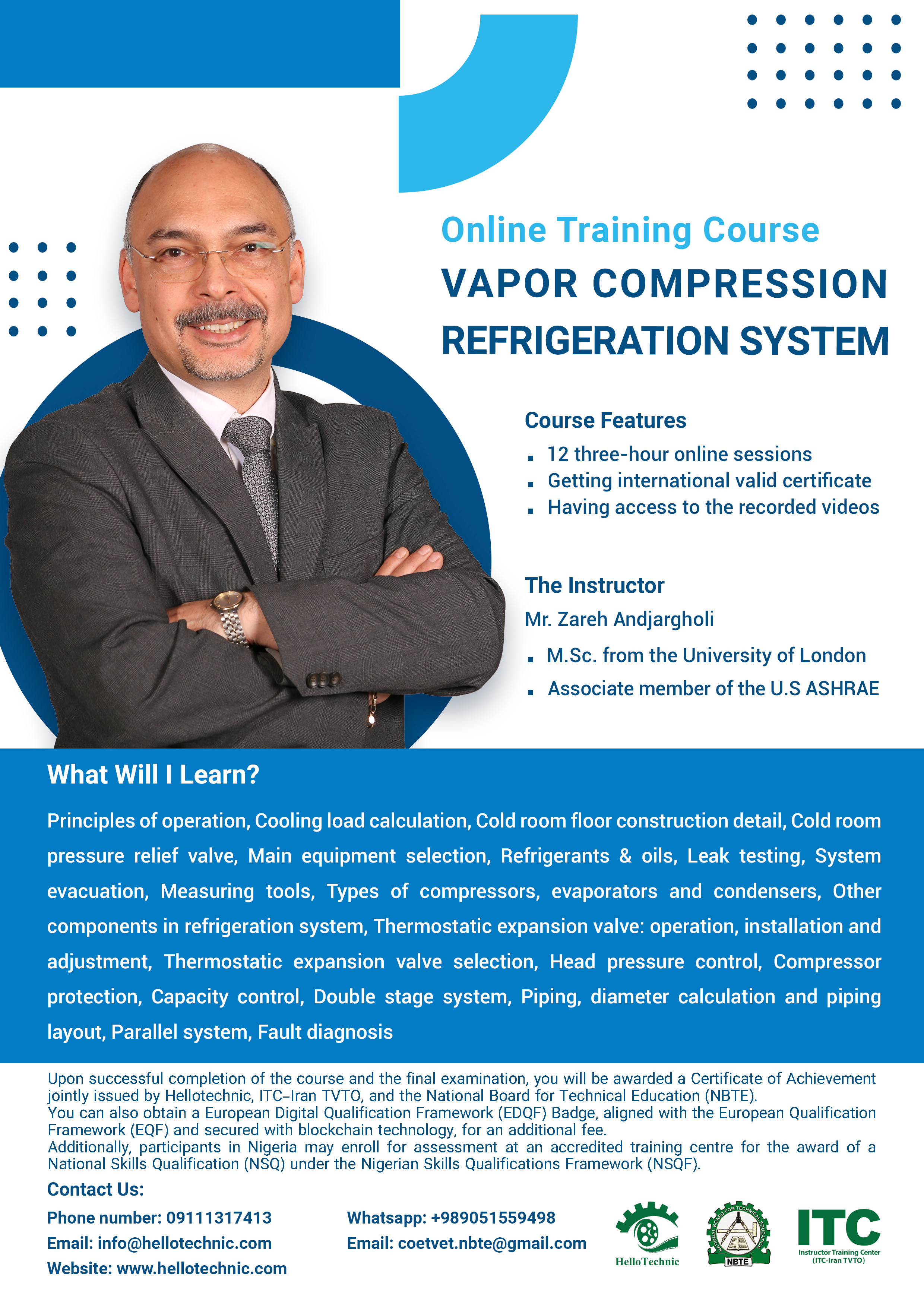 • Upon successful completion of the course and the final examination, you will be awarded a Certificate of Achievement jointly issued by Hellotechnic, ITC–Iran TVTO, and the National Board for Technical Education (NBTE).